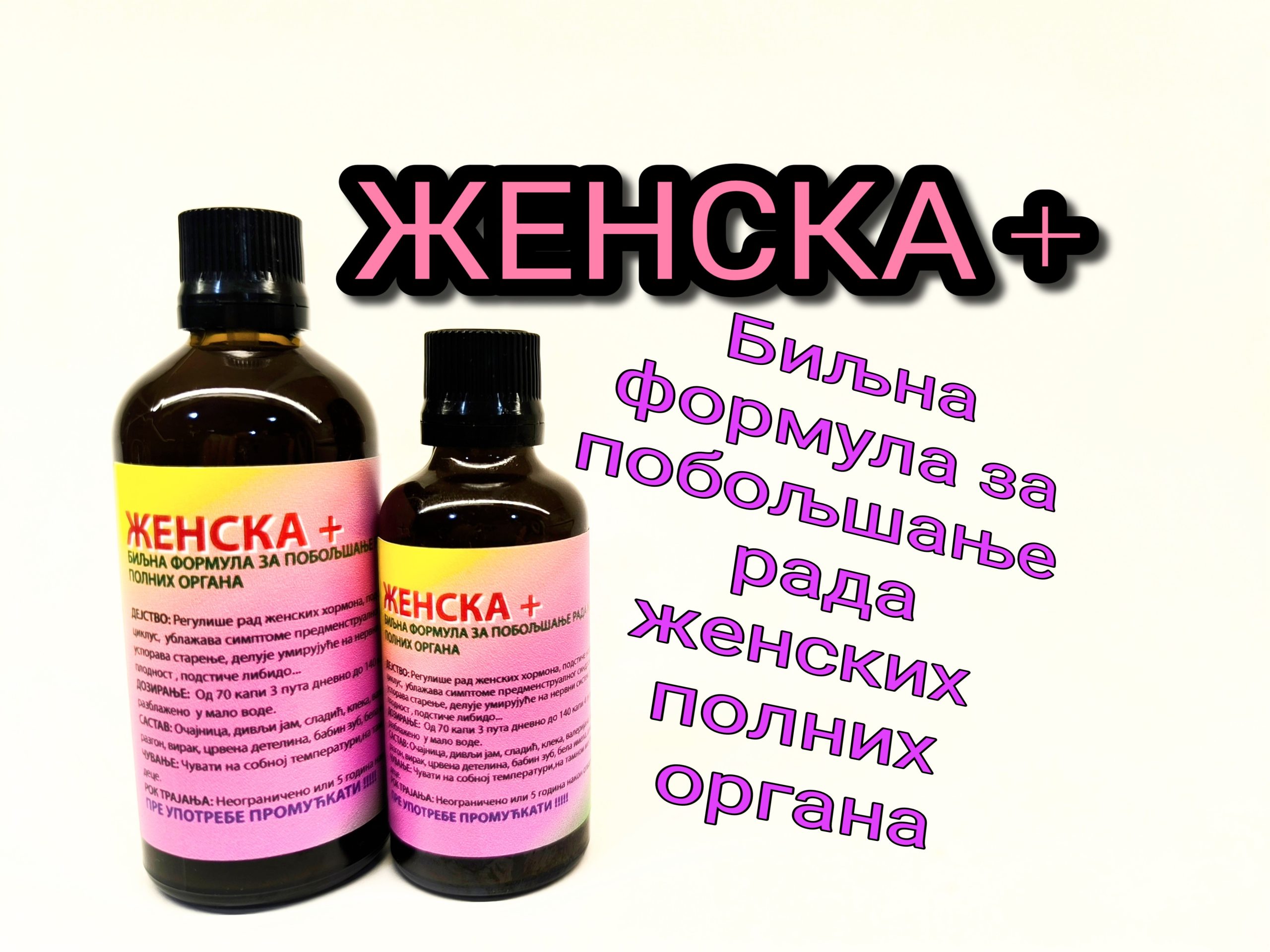 Sastav ženske formule koju smo mi nazvali ŽENSKA + je znatno jaći i kompleksniji u odnosu na aktuelnu ponudu slićnih preparata. Naša formula se sastoji sledećih lekovitih biljaka: Divlji jam, očajnica, sladić, anđelika, kleka, valerijana, uva, hmelj, virak, razgon, crvena detellina, babin zub, bela imela, alkohol 35 %.